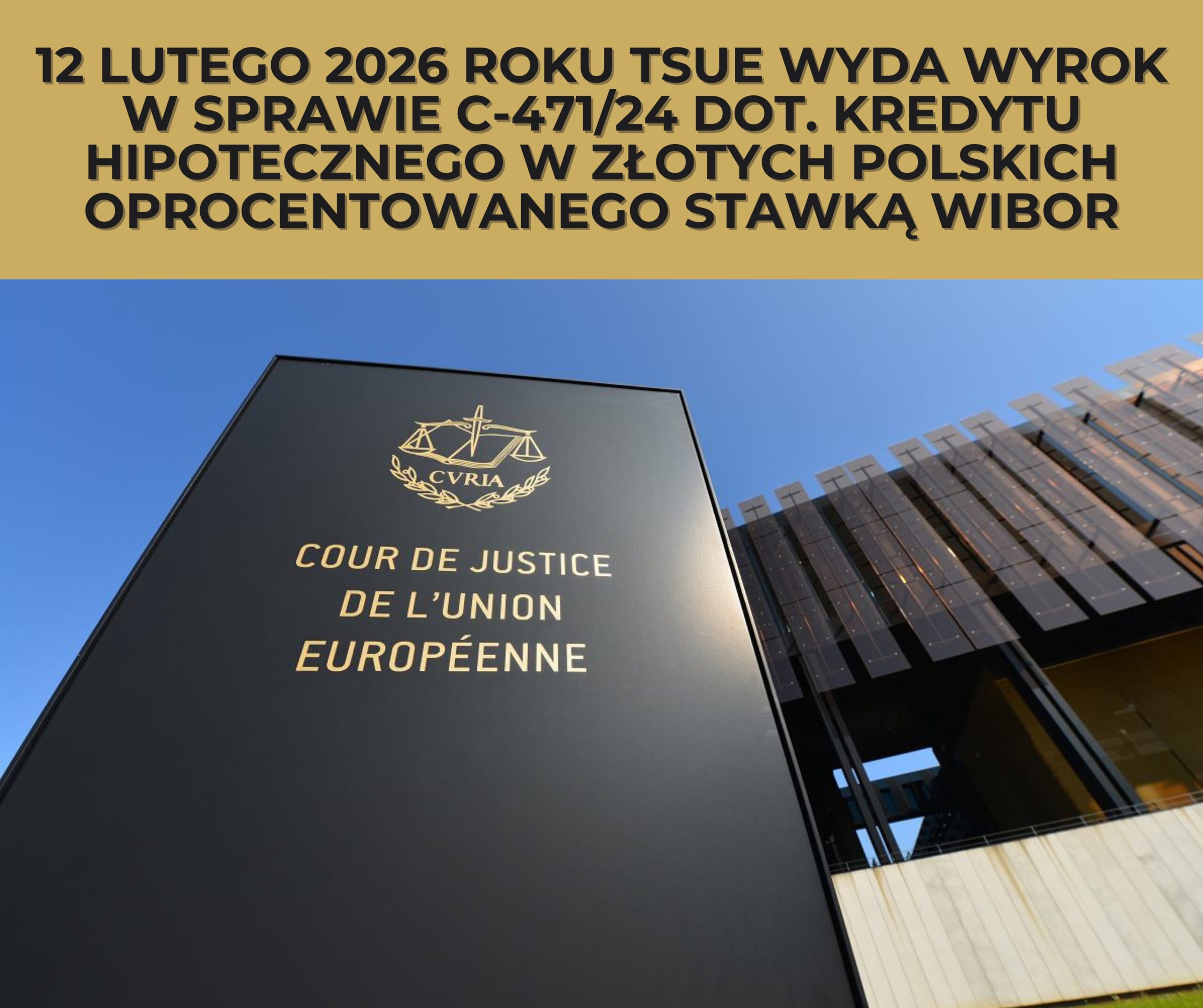Kredyt WIBOR TSUE i pierwszy wyrok w polskiej sprawie. 12 lutego 2026 roku o godz. 9:30 Trybunał Sprawiedliwości Unii Europejskiej ogłosi wyrok w sprawie C-471/24 – pierwszej polskiej sprawie prejudycjalnej dotyczącej kredytu hipotecznego w złotych polskich oprocentowanego według wskaźnika WIBOR. Sprawa została skierowana do TSUE przez Sąd Okręgowy w Częstochowie i dotyczy umowy kredytu zawartej w 2019 r. z PKO BP S.A.